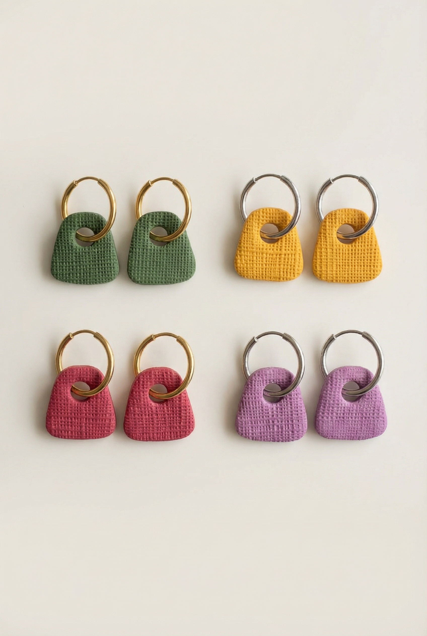 Handmade polymer clay hoop earrings with a square form, designed to add a contemporary yet playful touch to your everyday look. Minimal but eye-catching, they’re easy to style and comfortable to wear all day.